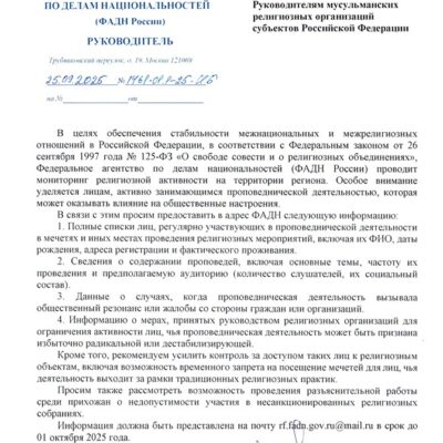 В сети распространяется информация о том, что Федеральное агентство по делам национальностей (ФАДН России) направило мусульманским организациям письмо с требованием усилить контроль за религиозной активностью.