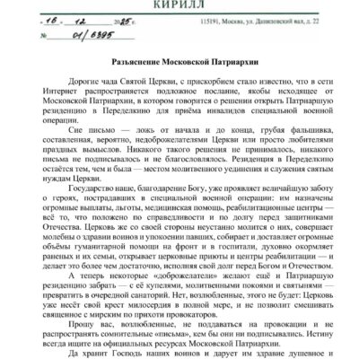 В последние дни в сети распространяется “письмо” от имени Московской Патриархии, где Патриарх Кирилл якобы объявляет об открытии своей резиденции в Переделкино для реабилитации инвалидов