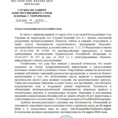 В распоряжении редакции РИА Новости оказалась копия письма Федеральной службы безопасности Российской Федерации, направленного 12 марта генеральному директору АО «Группа Кремний Эл» Олегу Николаевичу Данцеву.