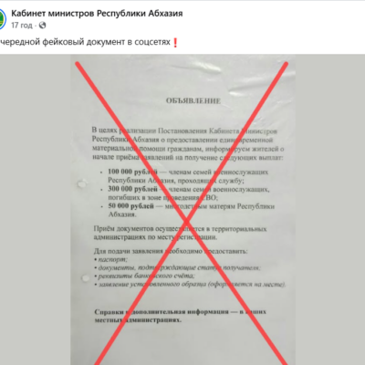 В последние дни в социальных сетях и мессенджерах Абхазии было зафиксировано активное распространение фейкового объявления, якобы информирующего о реализации Постановления Кабинета Министров «О предоставлении единовременной