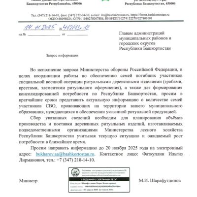 Министерство лесного хозяйства Башкирии рассылает главам районов тревожное письмо главам муниципалитетов: срочно подсчитать семьи погибших участников СВО, нуждающиеся в «ритуальных деревянных изделиях» — гробах, крестах,