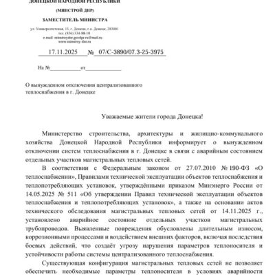 Министерство строительства, архитектуры и жилищно-коммунального хозяйства Донецкой Народной Республики распространило официальное обращение к жителям, в котором объявило о вынужденном отключении централизованного теплоснабжения почти во всех
